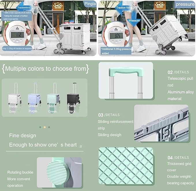 - UNIQUE DESIGN: This folding trolley is made of a robust and durable plastic housing with rust-resistant aluminium alloy handles (ultra-light), wear-resistant and pressure-resistant TPE rubber wheels, Unique 3-wheel climbing design and good cushioning performance, which provide the cart with a long practical service life. It is suitable for various roads, including blind roads, stairs, uneven sandstone ground, etc.