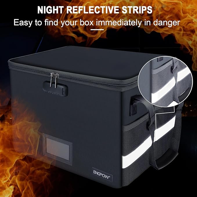 - Fireproof and water-resistant: Fireproof lock box is made of double layered non-itchy silicone coated fiberglass which stands up the temperature up to 2000℉.It has been passed by SGS TEST(UL94 VTM-0 Certified).Fireproof file box is not only fireproof but also high water resistant in case it gets wet for any reason.Nothing is completely foolproof, but added protection is always a good idea.