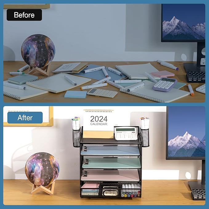 - ❥【Ample Capacity】- This desk file organizer is designed to keep your workspace organized and clutter-free, with 5 sliding trays + 1 sliding drawer with 3 compartments + 2 Hanging Pencil Holders (can be hung on or use separately), providing ample storage space for storing all your A4 Size paper file holders, office supplies and accessories.