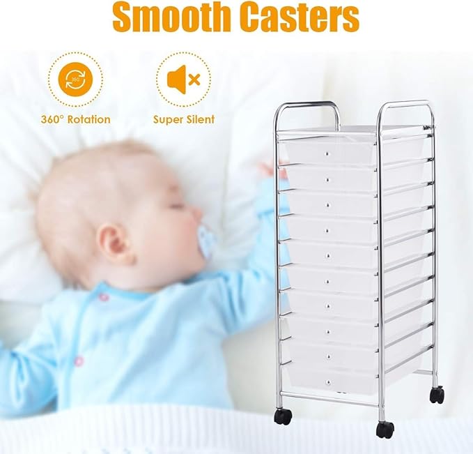 Storage Cart, Rolling Utility Cart with 10 Drawers, Portable Handles & Lockable Wheels, Mobile Paper Toys Storage Organizer Large Capacity for Home Office School Teacher (Clear)