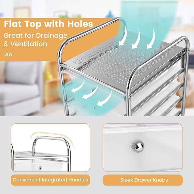 - ✨【Durable Metal Frame & 22 lbs Load】This rolling storage cart is supported by high quality chrome finished steel frame, which can hold up to 22lbs. Each drawer can hold 3lbs. Besides, the tabletop adopts a metal shelf with meshes, promoting better air circulation and keeping the interior dry and fresh.