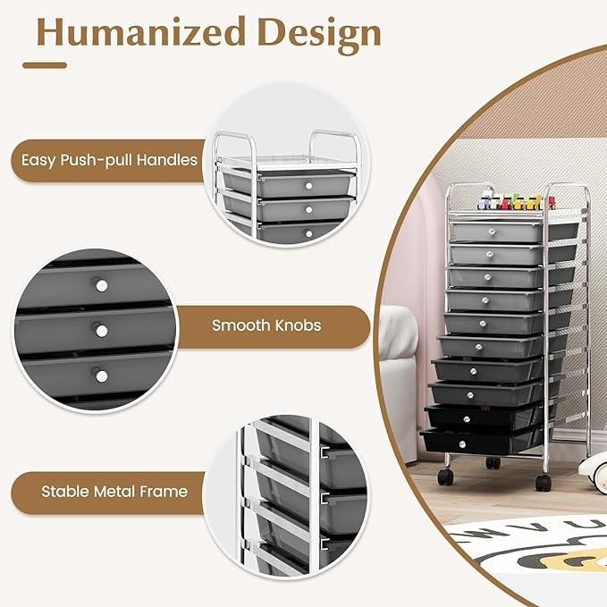Storage Cart, Rolling Utility Cart with 10 Drawers, Portable Handles & Lockable Wheels, Mobile Paper Toys Storage Organizer Large Capacity for Home Office School Teacher (Gradient Black)