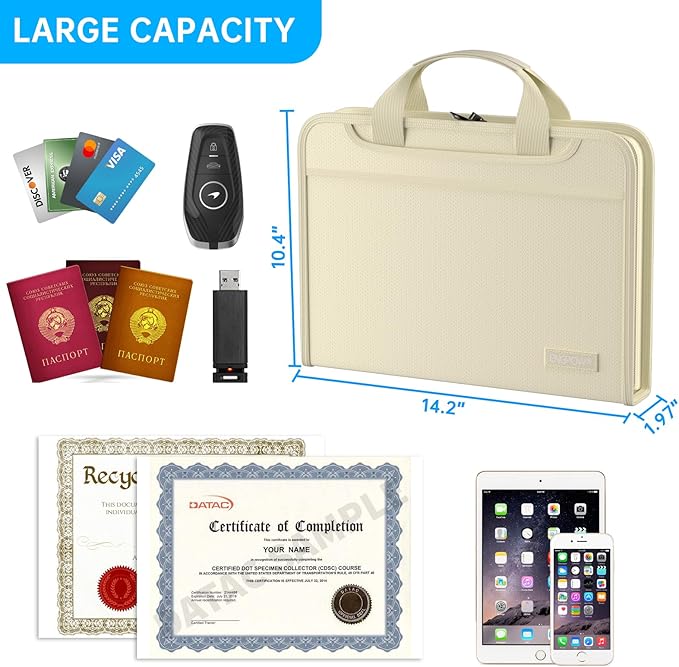 - Innovative Humanized Design: Design with a strong grab handle for carrying everything you needed easily. Featuring a double zipper for convenient opening and closing,you won't have to worry about losing any important documents. The included colorful labels make categorizing your files effortless. The fireproof file folder is suitable for business, travel, office, school, home storage, you can be 100% sure that your important documents are in a safe place.