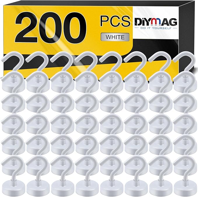 DIYMAG Magnetic Hooks, 25Lbs Strong Heavy Duty Cruise Magnet S-Hooks for Classroom, Fridge, Hanging, Cabins, Grill, Kitchen, Garage, Workplace and Office etc, (200Pack-White),Screw in Hooks