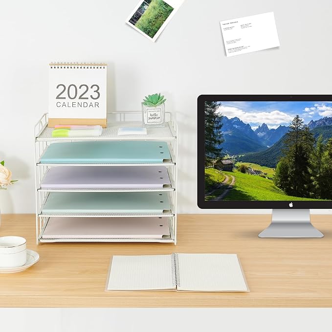5 Tier Mesh Paper Letter Tray Organizer, Desktop Mail Sorter Office Supplies Organizer for Desk, Desk Organizers and Accessories (White)