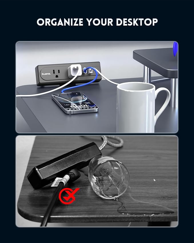 - đăDesk Power Strip with USB Portsă Equipped with 2 AC outlets, 1 USB-C port, and 1 USB-A ports, Offers a space-saving solution by securely attaching to the edge of your desk, providing easy access to multiple outlets without taking up valuable surface space, Ideal for offices, home workstations, or gaming setups.
