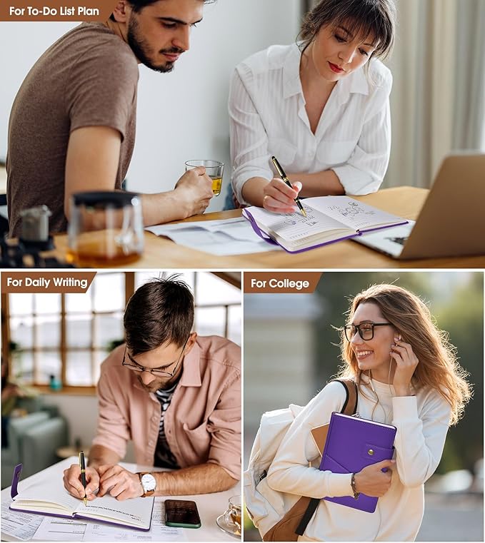 - 【PREMIUM THICK PAPER】:5.9 X 8.4 inch journal notebook with 200 pages 100 gsm lined paper, thicker 30% than normal, this purple notebook is designed to avoid feathering and the paper is ink-proof, suit for most pens, but the wettest pen inks. Archival-quality pages made from acid-free paper-resists damage from light and air, the cream paper is easy on eyes.Let your creation more freedom on the wide ruled journal to write in.