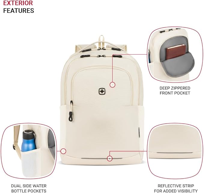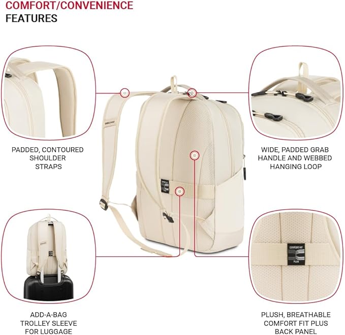 - Add-a-Bag Strap: A must-have travel backpack for men and women, this SwissGear backpack includes an add-a-bag rear strap that fits over luggage extension handles for easy and convenient movement through airports