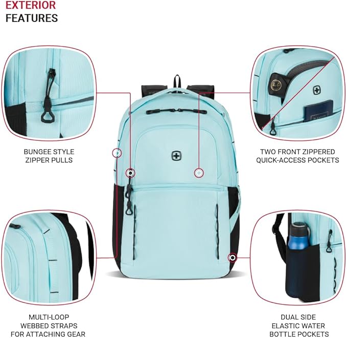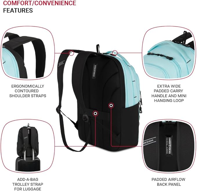 - Add-a-Bag Strap: A must-have travel backpack for men and women, this SwissGear backpack includes an add-a-bag rear strap that fits over luggage extension handles for easy and convenient movement through airports