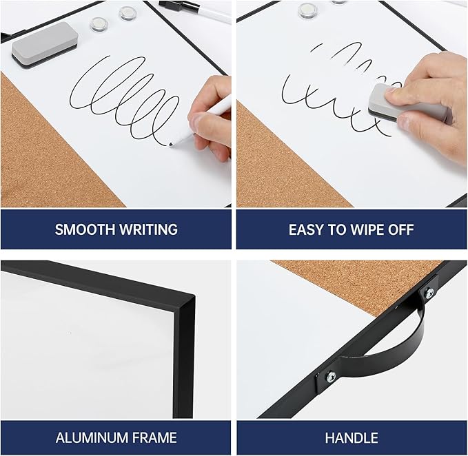 • PREMIUM QUALITY: This 12" X 16" small whiteboard set includes a dry erase board and corkboard. The magnetic whiteboard comes with a smooth surface, easy to clean up and write on. The bulletin cork board is equipped with premium durable cork, fits all variety of nails and pins without damage to the cork.