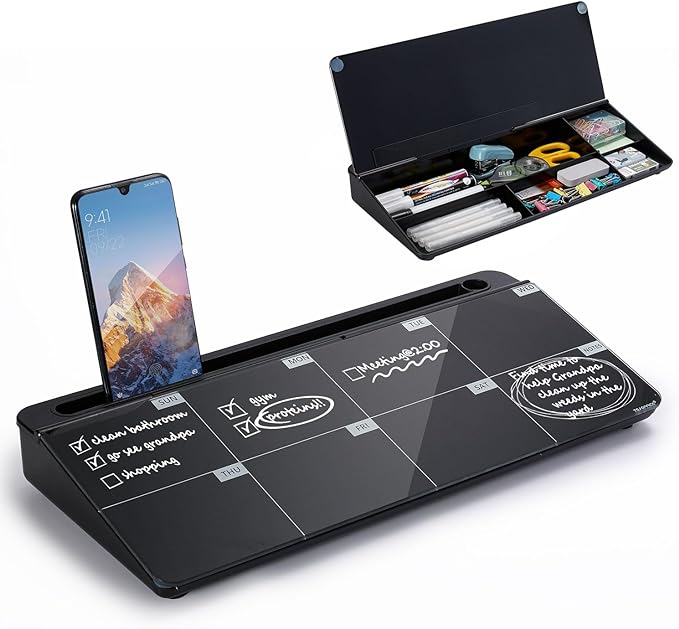 • HIDDEN STORAGE & PAD/MOBILE TRAY: De-clutter your desk by storing markers, magnetic eraser and other desktop accessories in the opening drawer or place markers on the accessory tray for quick access. And one more long tray on the top of the dry erase white board for your pad or mobile.