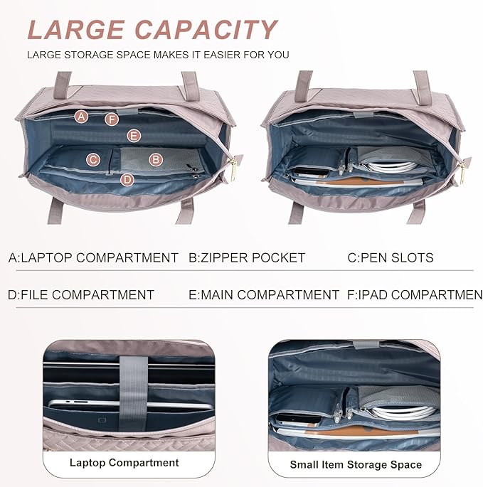 EMPSIGN Laptop Tote bag for women 16 Inch, Stylish Computer Shoulder Tote Bag for Work, Large Capacity Quilted Laptop Briefcase, Waterproof Women Business Office Bag, Quilted Grey Pink