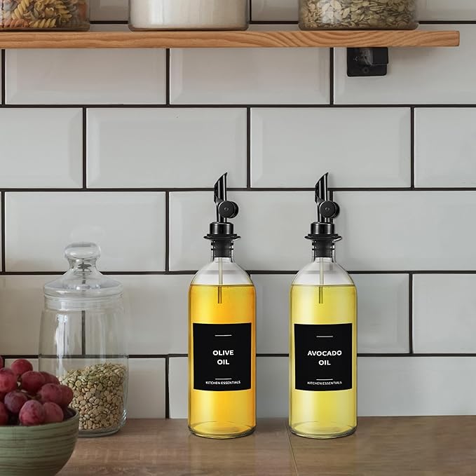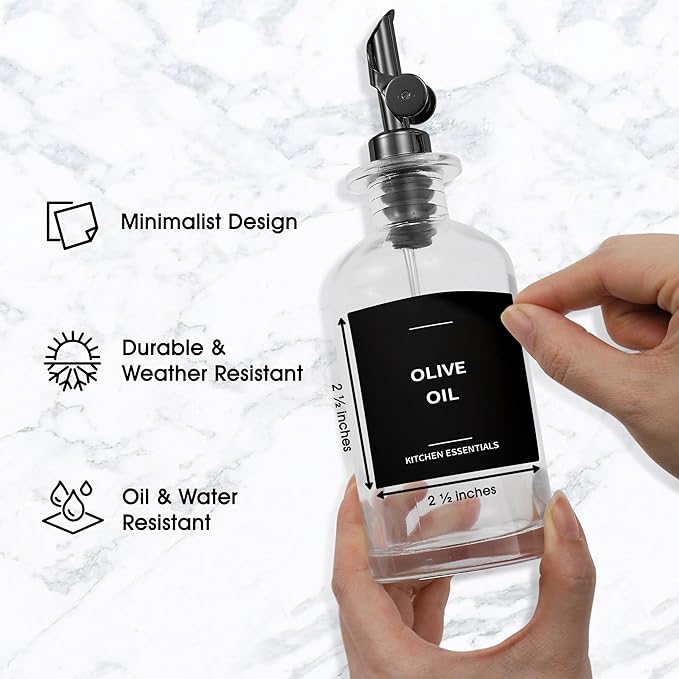Olive Oil Labels for Glass Bottles - 2.5" x 2.5" Waterproof & Oil-Proof Kitchen PVC Sticker Labels for Oils, Vinegars, Sauces, Cooking Wines & Condiments - Minimalist Black, 39pcs