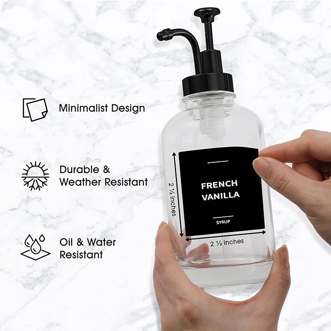 Coffee Syrup Labels for Bottles, Syrup Dispensers - 2.5" x 2.5" Waterproof & Durable PVC Stickers - Modern Coffee Bar Essentials for Home, Kitchen, Beverage Station - Minimalist Black, 22pcs