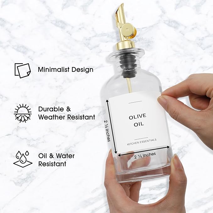 Olive Oil & Coffee Syrup Labels for Bottles - 2.5" x 2.5" Waterproof Kitchen PVC Sticker Labels for Oils, Coffee Syrups, Vinegars, Sauces, Cooking Wines, Condiments - Minimalist White, 61pcs