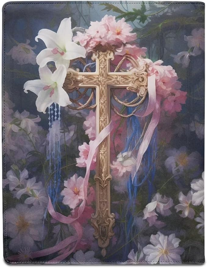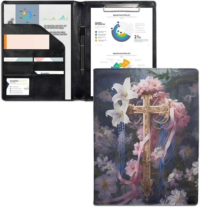 Cross Flower Print PU Leather Padfolio Clipboard Clip Business Resume Portfolio A4 Folder Interview Legal Document Organizer Business Card Holder Letter