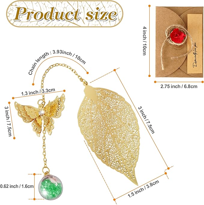 - Feather bookmark (12cm) adorned with a gold brass leaf design (7.8x3.8cm), featuring an exquisite gold brass butterfly (3.5x2.5cm) and a glass sphere containing a diamond and dried flowers. Presented in a chic craft paper gift box.