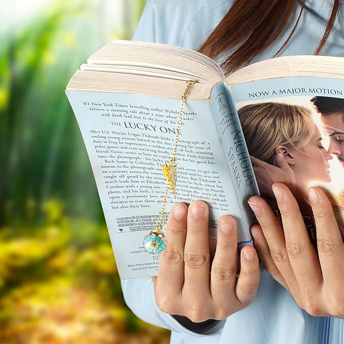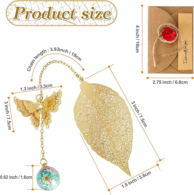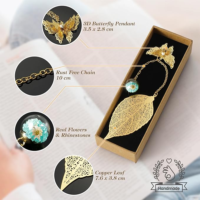 - Feather bookmark (12cm) adorned with a gold brass leaf design (7.8x3.8cm), featuring an exquisite gold brass butterfly (3.5x2.5cm) and a glass sphere containing a diamond and dried flowers. Presented in a chic craft paper gift box.