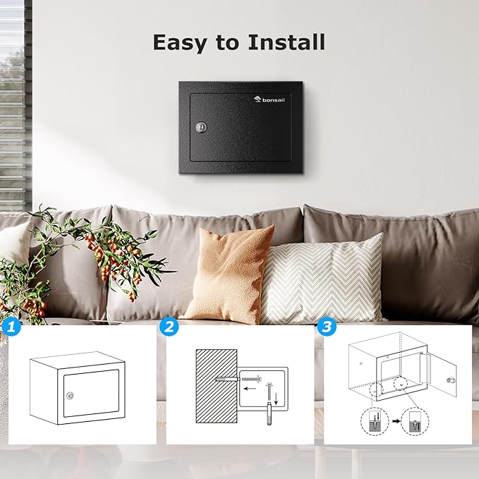 - Easy to Install: Bonsaii security safe box is equipped with two pre-drilled mounting holes both on its back and bottom, available to mount this safe to shelf, wall or floor; Easily protects your privacy items out of view