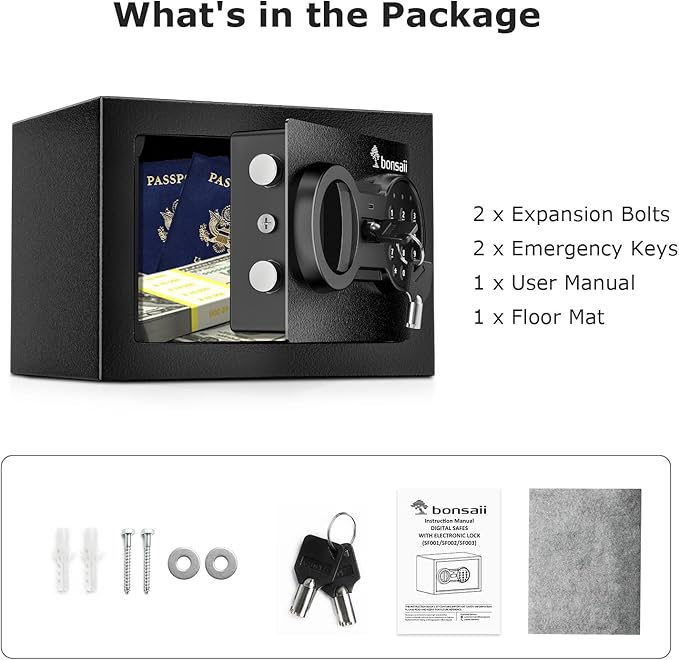 - What's in the Box: 1 x Bonsaii Safe Box, 2 x Emergency Keys, 2 x Expansion Bolts, 1 x Floor Mat, 1 x User Manual. Note:Batteries are NOT included