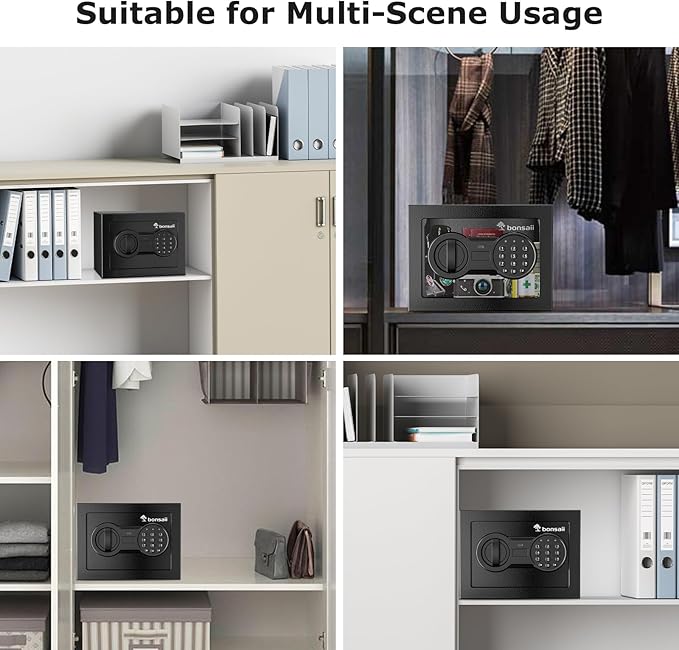 - Built with High Strength Construction: The bonsaii small safe box is made of high-quality SPHC steel, making it stronger and more durable to keep your valuebles safe. It is equipped with two 18mm diameter active locking bolts, which combined with the 0.8mm steel plate and 1.5mm door panel, provide the money safe box with excellent anti-drlling and pry-resistant to maximize the protection of your cash, passport, jewelry, ect