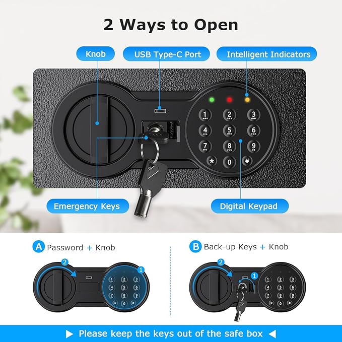 - 2 Ways to Open: This home safe is equipped with a electronic keypad lock that opens by entering a 3-8 digit personal code and also comes with 2 emergency keys in case you forget your code. This digital safe is also thoughtfully equipped with a Type-C port for charging the electronic keypad lock, so you won't have to worry about the lock's batteries dying and not opening