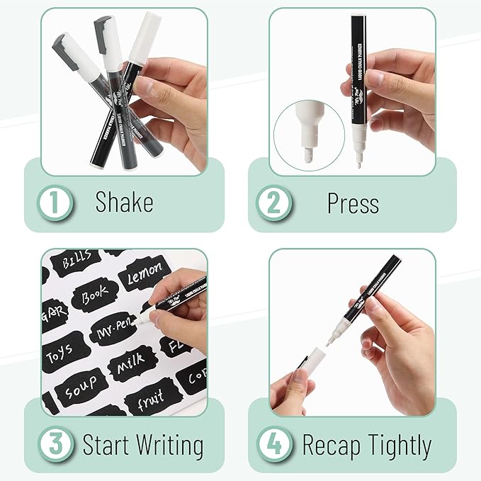 - The included white chalk marker writes smoothly on the labels and can easily be wiped off with the small towel, allowing you to update labels as needed.