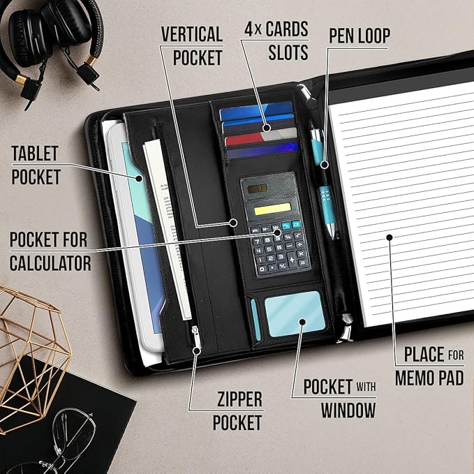 - [Professional & Versatile]: Use this durable and elegant padfolio for work, studies, or organizing important documents. Includes a secure organizer with sheet holder, zipper compartment, calculator, and pad of sheets. Perfect for office, interviews, and meetings.