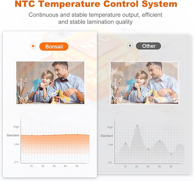 - 【Three Heat Settings】Bonsaii Laminator offers 3 heat settings, 3mil, 5mil and photo selection, laminator machine 13 inch wide features NTC temperature control, ensuring a stable laminating effect. With precise temperature control, you can achieve optimal laminating results.