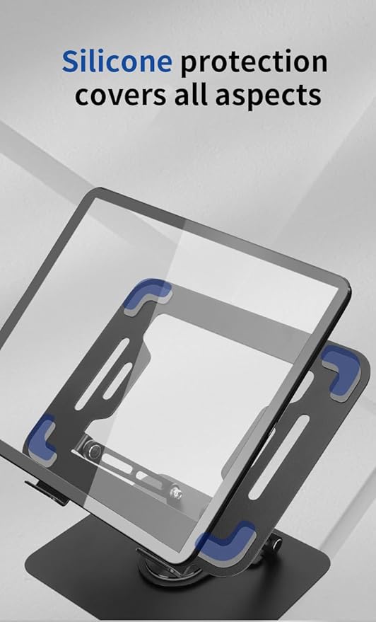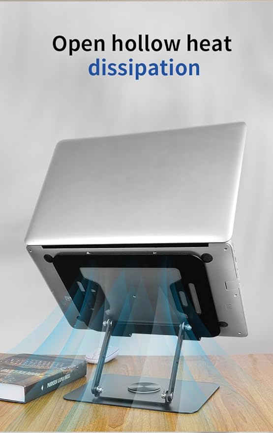 - 【Ergonomic Design】This laptop stand with 360 rotating base is featured with adjustable heights allows you to swivel your laptop to any angle. Not only does this help maintain a healthy posture, but it can also prevent eye strain and overall discomfort.which helps to minimize cervical spine as well as back discomfort due to incorrect sitting posture. Using the stand can reduce the pressure on your eyes and neck.
