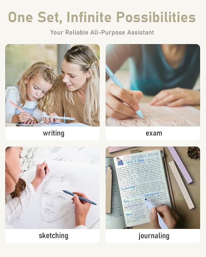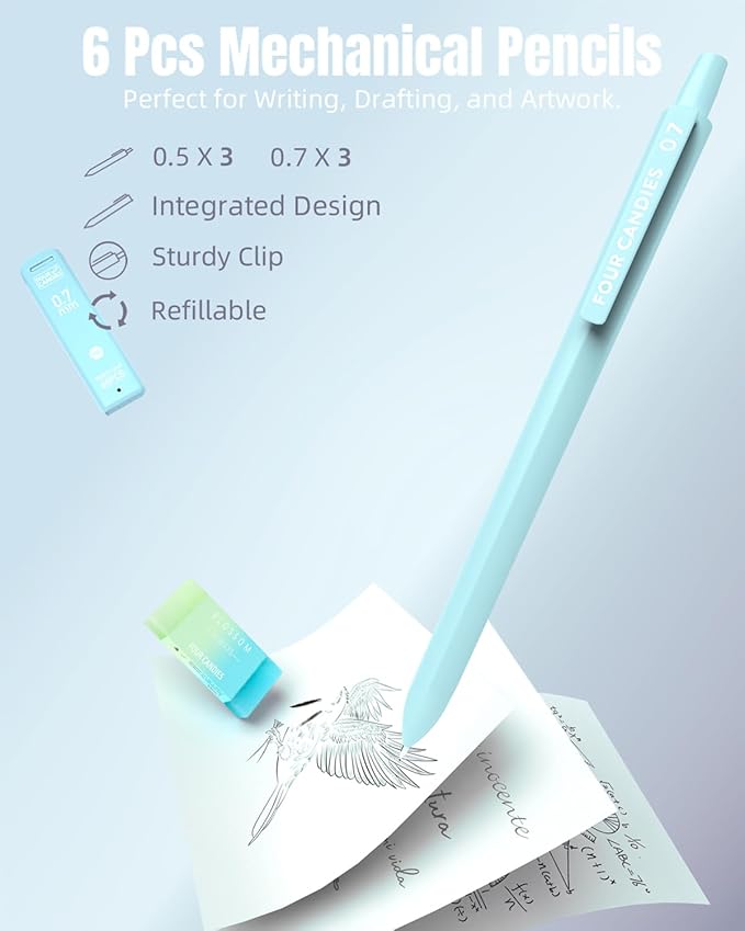 - 6PCS Mechanical Pencils Set for Artists: This set includes 3 pencils with 0.5 mm leads, 3 with 0.7 mm leads, 6 tubes of #2 lead refills, 3 jelly erasers, and 9 cap eraser refills; The ergonomic triangular grip fosters a comfortable hold, ensuring a pleasant writing and drawing experience; Note: This set is suitable for children over 3 years old