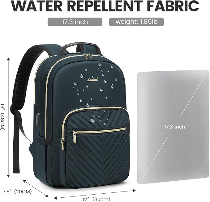 - 💯【Upgraded Laptop Backpack Women】: Classic V-shaped embroidery thread. Upgraded double LOVEVOOK no-slip metal zippers,water resistant Nylon fabric with polyester lining, ensures long lasting usage. Total of 4 compartments and 16 pockets for your computer,A4 folder,bottles,umbrellas,clothes,work supplies,college supplies and travel essentials.Dimensions: 12"L 19"H 7.8"D, Weight: 1.86lbs.