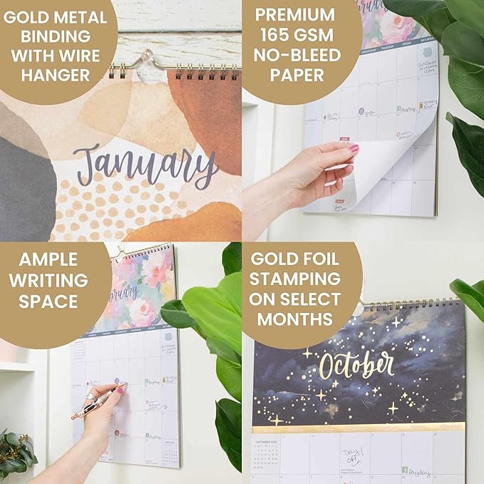- PREMIUM FEATURES: Extra thick 165gsm bright white paper that won't bleed through and a sturdy gold wire hanger. Bonus features include shaded weekends, holidays, and daylight saving time integrated into the calendar.