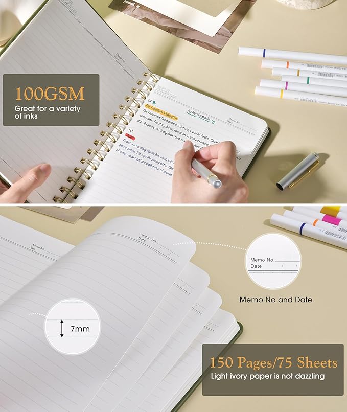 - 【A5 Journal with 100 GSM High-Quality Paper】 Crafted from 100 GSM thick ink-friendly paper, our notebook prevents ink bleed-through and ghosting. It accommodates various pens, including ballpoint, gel, and fountain pens. Standard 7mm-space Classic College Grid Notebook with “Memo Number” and “Date” headings on each page to help you keep track of dates. A5 size 5.75" x 8.38", perfect size for carrying around or put into your bag or purse.