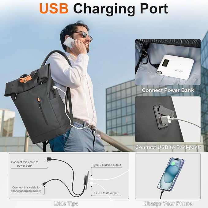 - ▼ Ergonomic and User-Friendly: This laptop backpack stands out with its sleek exterior design and thoughtful interior layout. The men’s work backpack features multiple internal compartments, some with zippers or elastic mesh, along with an integrated USB charging port for easy connection to a power bank, allowing you to charge your phone on the go. It also includes a front pocket with a snap closure and a small waterproof zippered pocket, providing great convenience