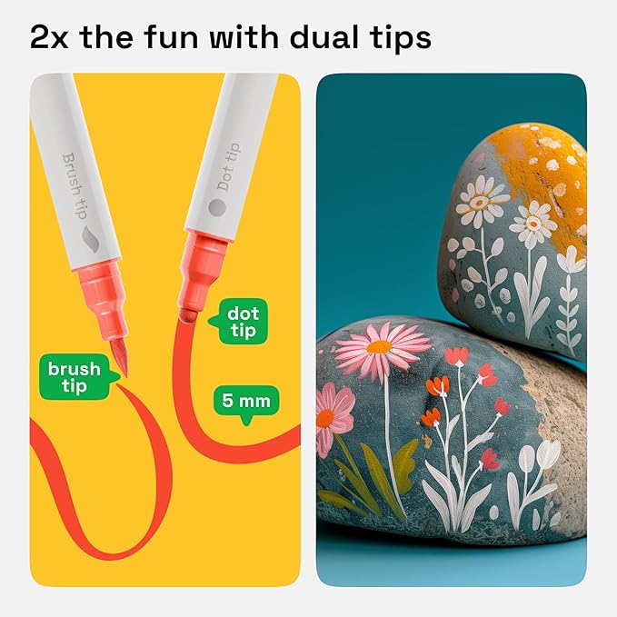 - DUAL TIP: Our acrylic paint markers come with 2 tips for 2x the fun. The acrylic paint pens are equipped with a dot tip and a brush tip. Get the most out of your paint pens acrylic markers with a vibrant palette of colors!