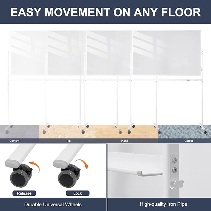 - 360° ROTATED & LOCKABLE - The mobile dry erase board comes with 4 durable universal wheels that support 360-degree rotation, allowing you to move easily whether on hard floors or carpets. Each wheel has a locking system to keep it stable while writing and wiping.