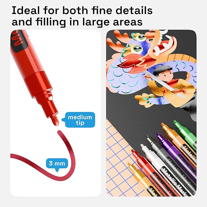 - 3mm Tip for Coloring: Make details with metallic marker pens fine point. Use the black paint pen or color metallic paint pens fine for outlines, lettering, and adding labels. Fine metalic markers are easy to activate.