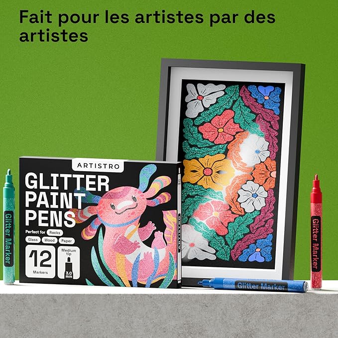 ARTISTRO 12 Glitter Paint Pens Sparkly and Shiny for Rock Painting, Stone, Ceramic, Glass, Wood, Fabric, Scrapbooking, DIY Craft Making, Coloring, Acrylic Glitter Markers, Medium Tip 3.0mm