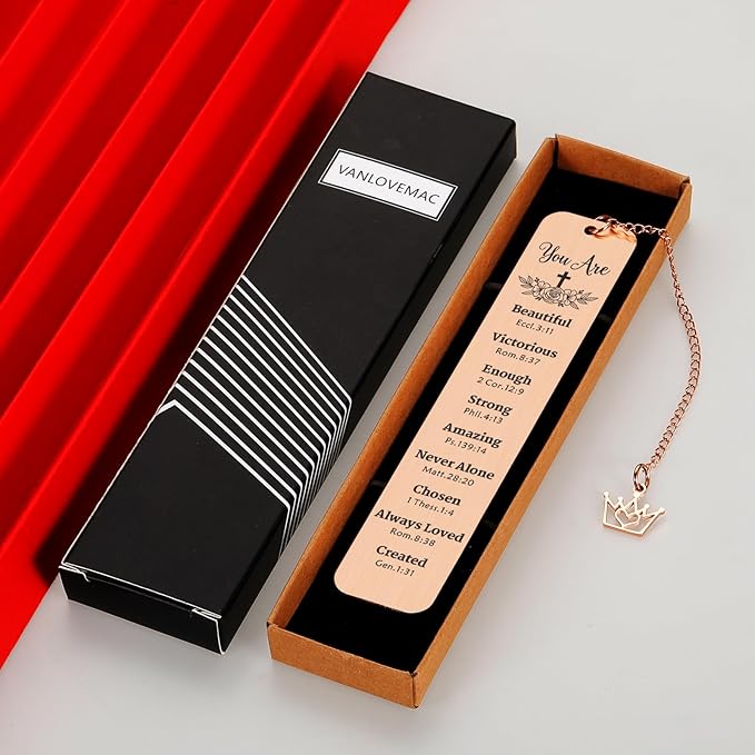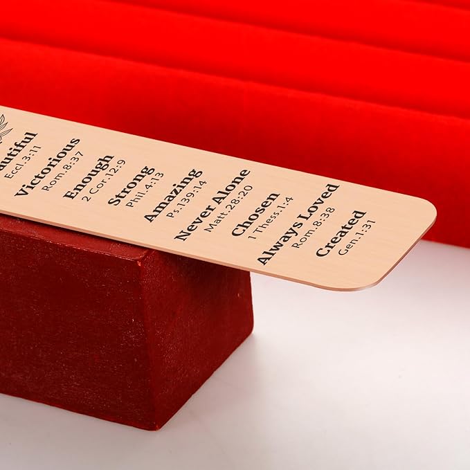 - Christian bookmark for women: Metal bookmark with chain and inspirational bible verse: "You Are Beautiful Eccl.3:11, Victorious Rom.8:37, Enough 2 Cor.12:9, Strong Phil.4:13, Amazing Ps.139:14,Never Alone Matt.28:20,Chosen 1 Thess.1:4, Always Loved Rom.8:38, Created Gen.1:31" . Bible bookmarks for women mom grandma stepmom families best friend coworkers female.