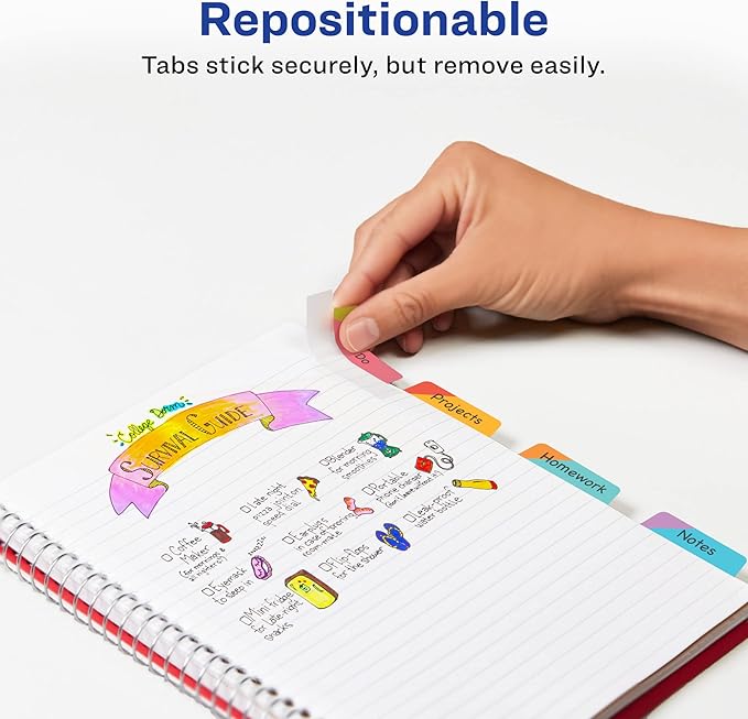 - Special Feature : Margin tab design, clear body, pre-printed subject tabs, blank colored tabs, removable self-adhesive, writable with most pens, pencils, and highlighters Margin tab design, clear body, pre-printed subject tabs, blank colored tabs, removable self-adhesive, writable with most pens, pencils, and highlighters