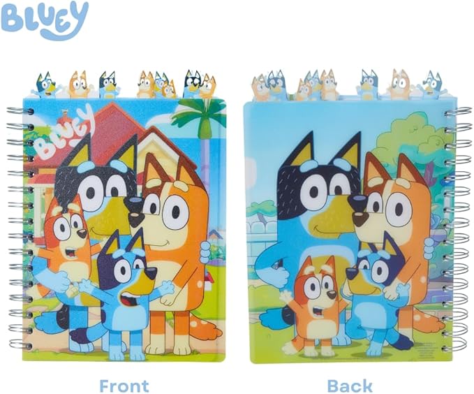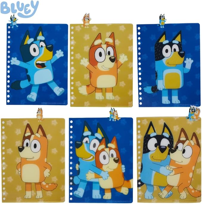 - BLUEY NOTEBOOK - Features Bluey, Mum, Dad, and Bingo on the front cover, lined pages with color images of Bluey characters on the corners, 6 color illustrated section dividers, and tab dividers.