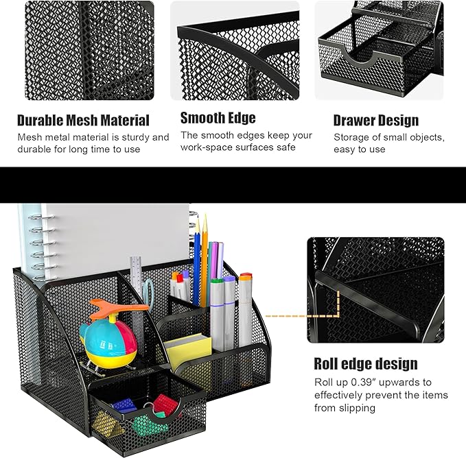 - 【Utility Desk Accessories & Workspace Organizers】 A rich combination of one multifunctional desk organizer and 11pcs cute desk accessories can meet your daily needs, keeping your desktop organized. The mesh desk organizer comes with 6 parts and 1 sliding drawer, which can be used as a cosmetic organizer or stationery organizer.