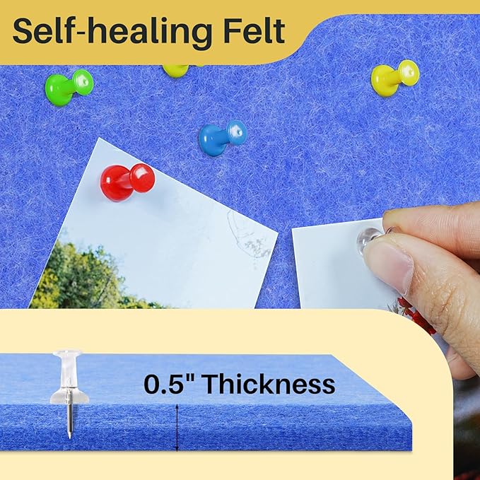 - High-Density Felt Board: Our cork bulletin board features a high-density 1/2 inch thick felt construction that holds up against multiple nailing without visible holes, and push pins will not go through your corkboards or break your wall, durability and longevity