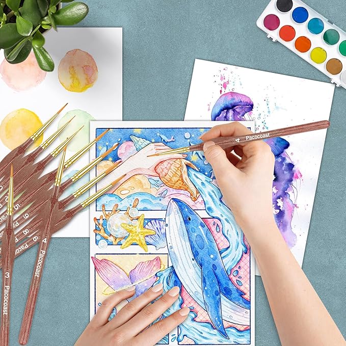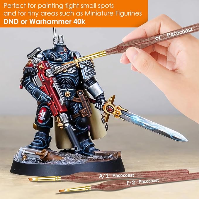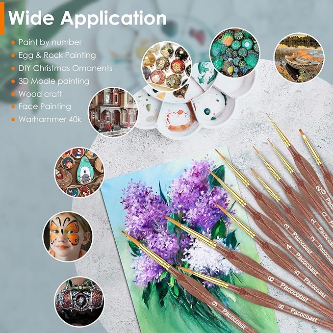 - [All-Purpose Detail Painting Brush]: Pacocoast paintbrush allow you to do fine detailing and art painting, precisely reaching tight little gaps or tiny points. They work well with a variety of paints, including oil, watercolor, acrylic, enamel and gouache. Ideal for a wide range of art projects: painting dnd miniatures figures, Warhammer 40k, Army Painter, miniature painting kit, games workshop, arts and craft, leather, rock, face painting, ceramic models and paint by numbers for adults.