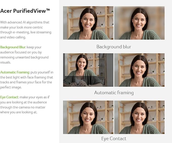 - Enhance Your Webcam Experience: The 1080p FHD webcam featuring Acer PurifiedView and Acer PurifiedVoice 2.0 with AI noise reduction and triple microphone array making collaboration a breeze. These technologies work together to boost the video call experience reducing background noise, blurring your background, staying in focus, and more – so you always look and sound your best.