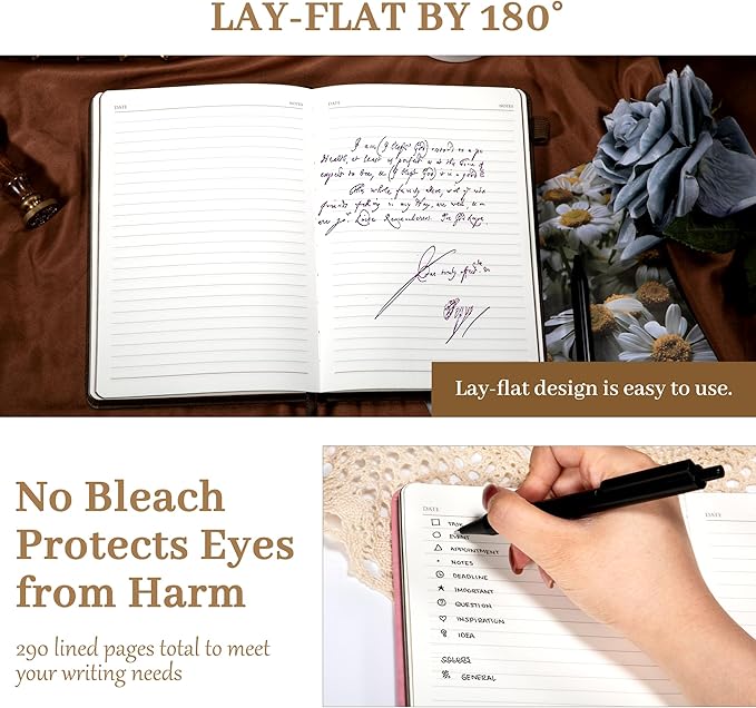 - PREMIUM LINED PAPER - Journals for writing has 145 sheets/290 pages of lined paper; The rounded corners of the paper can protect the diary from curving. It can be 180° lay-flat,making it a pleasure to write in. Used 100gsm bleed proof paper, to ensure a quality writing experience without ghosting and ink-bleeding.