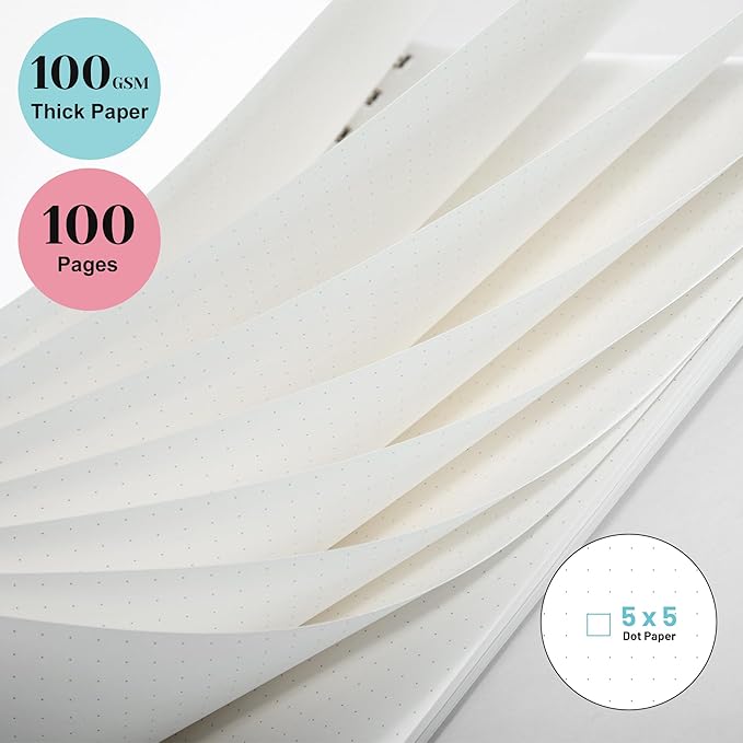 - 100 GSM High-quality Paper -- This dot grid notebook uses 100gsm premium acid-free paper, 5 x 5mm, which is thicker than traditional paper, can write on both sides, no ink feathering and bleeding. Suitable for most pen types. 50 sheets/100 pages dot paper, It can provide you with a lot of creative space.