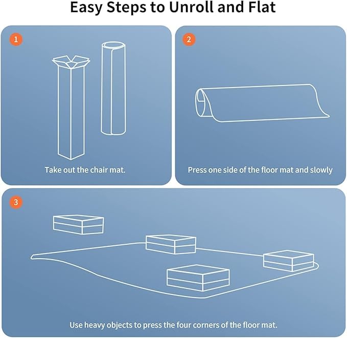 - Rolled Up Packaging: WASJOYE chair mat will be delivered in a rolled up packaging, but they will return to flatness quickly. Please add weight to the rolled corners of the office chair mat. The heavier the weight, the faster it will return to flatness
