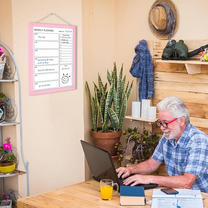 Dry Erase White Board Weekly Calendar Board, Magnetic Whiteboard for Wall,13“x17 Solid Wood Pink Framed Message Board, Planner Board for Office, Home, School(Weekly-BB-PK-3343)